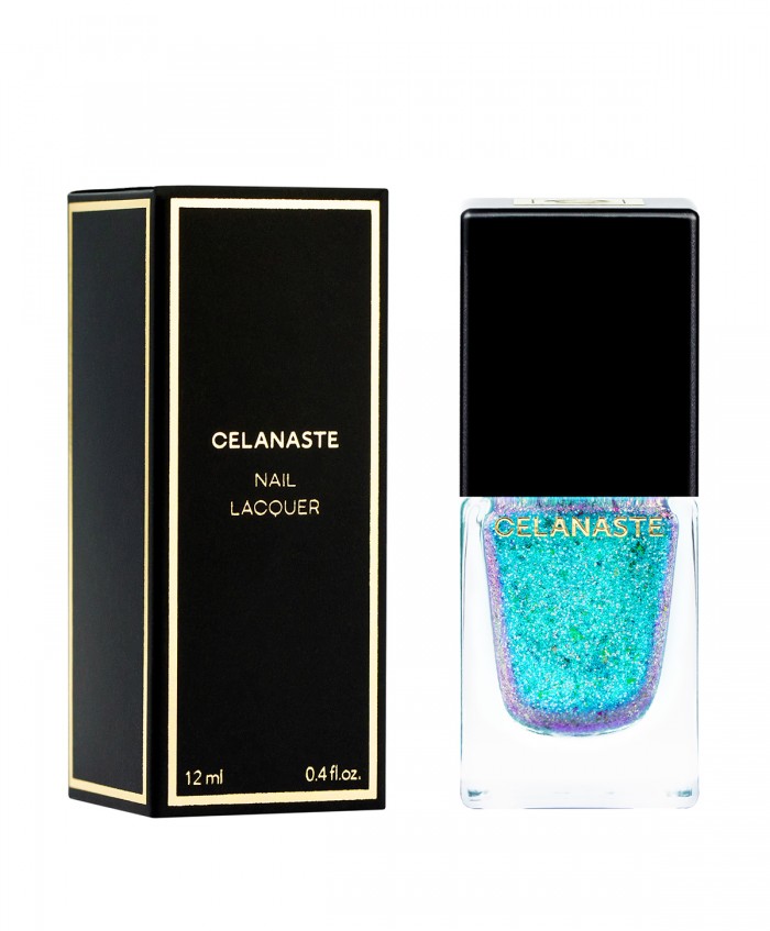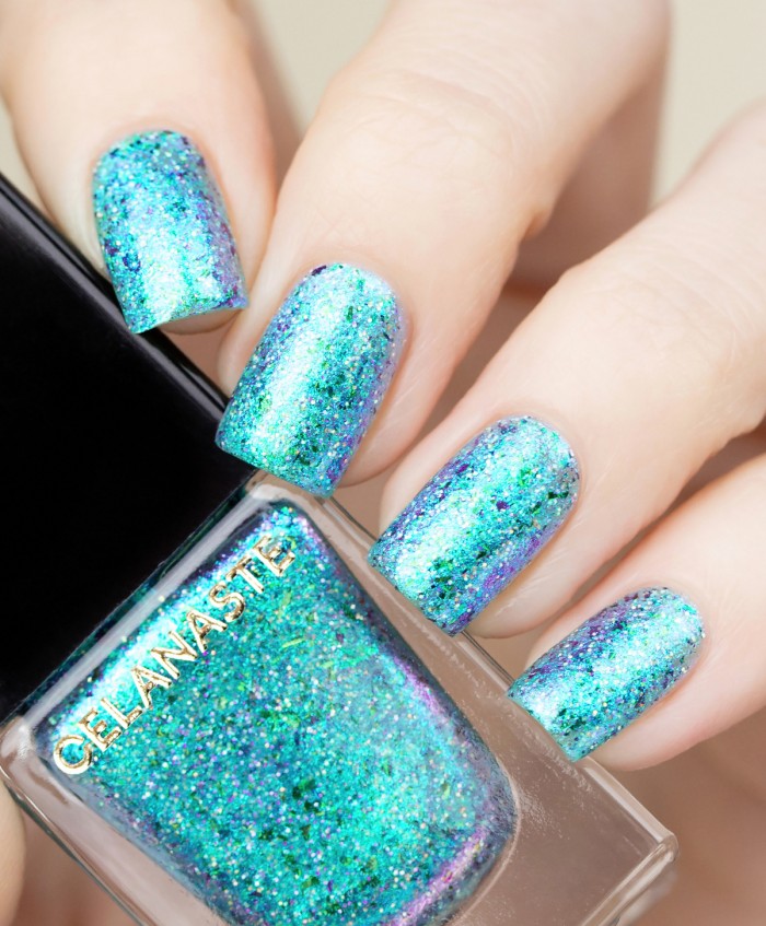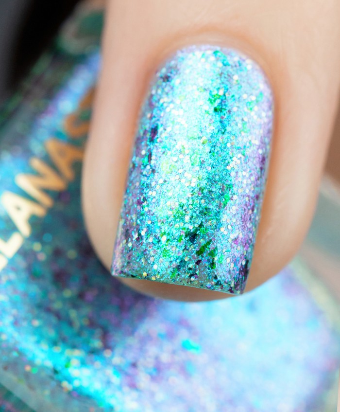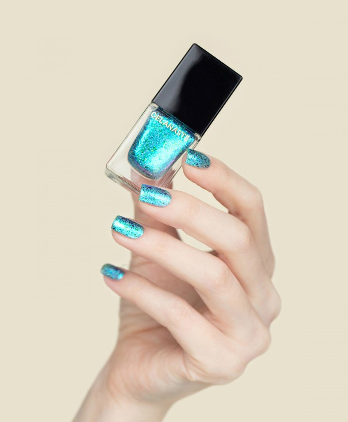 ОПИСАНИЕ: очень яркий и необычный лак, имеющий в своем составе мультихромный металлизированный шиммер, а так же слюду и голографический глиттер.