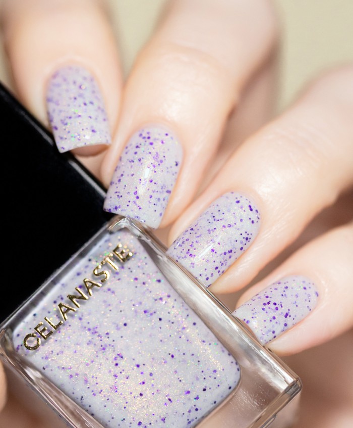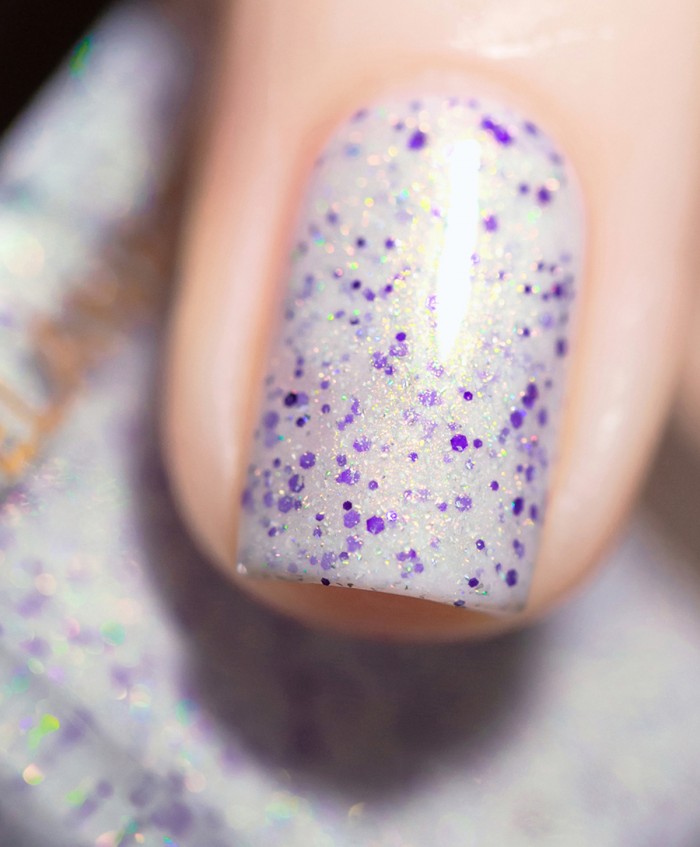 ОПИСАНИЕ: лак с содержанием фиолетового глиттера, разноцветного шиммера и голографии.