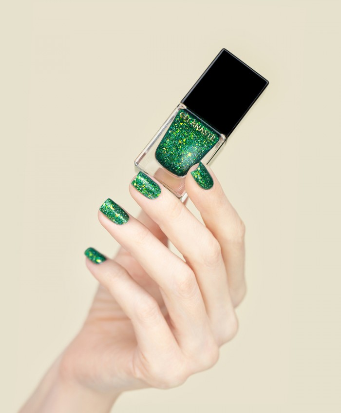 При дневном освещении на ногтях красиво играет слюда, при искусственном освещении раскрывается голография.